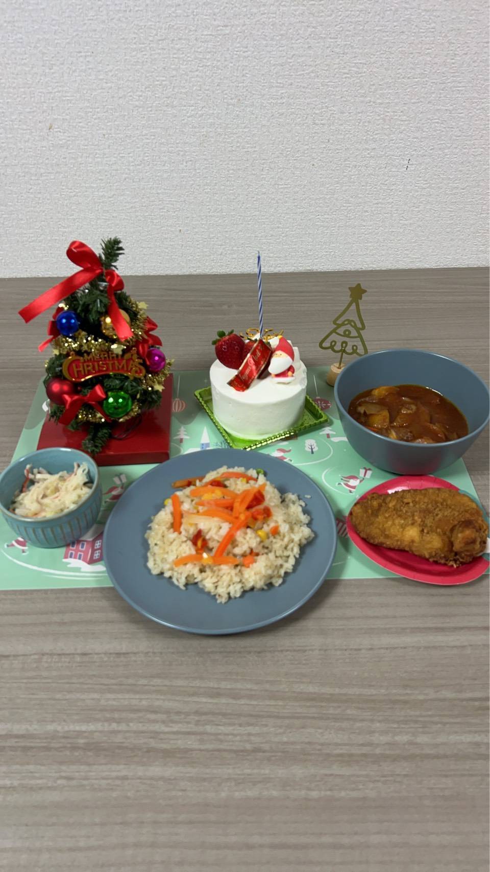 クリスマスならではのチキンとケーキ、クリスマスツリーで華やかなパーティーとなりました。